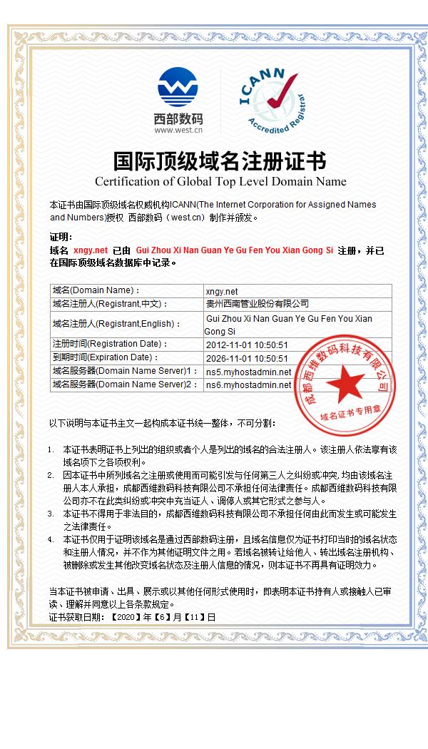 | 權(quán)屬證明 | 證書由國際頂級域名權(quán)威機構(gòu)ICANN(The InternetCorporationforAssignedNamesandNumbers)授權(quán) 西部數(shù)碼(westcn)制作并頒發(fā)。 | |||||||